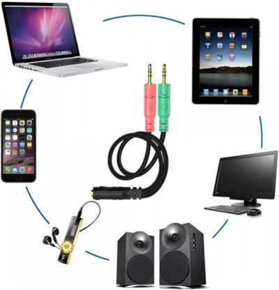 Function: Converts a single 3.5mm female headset jack into two 3.5mm male plugs – one green for audio output and one pink for microphone input.