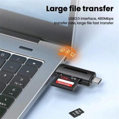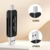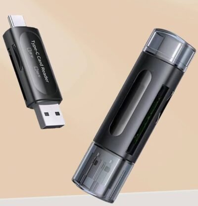 Dual-port Type-C & Micro-USB card reader with USB 3.0/2.0 support for ultra-fast transfers. Compatible with SD, TF, MMC cards. Works with Android OTG phones, tablets, laptops & PCs. Plug & play – no drivers needed.