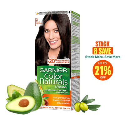 Enhance your look with Garnier Color Naturals – 3 Dark Brown, a rich, radiant shade designed to deliver salon-quality results at home. This long-lasting formula provides up to 8 weeks of vibrant color while nourishing your hair from root to tip.