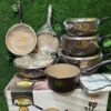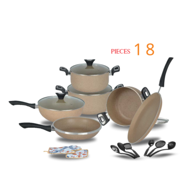 Premium AR cookware set with 18 and 19 pcs options, featuring double marble coating inside and outside. Heavy-weight, durable, and non-stick—perfect for healthy cooking and a great gift pack.