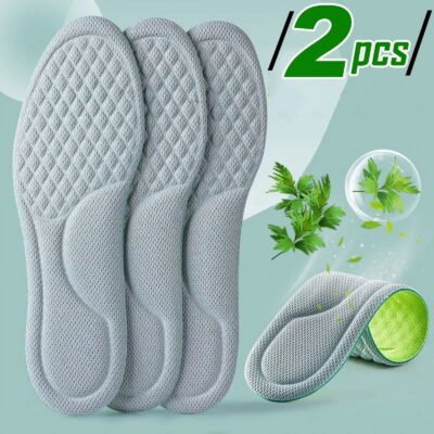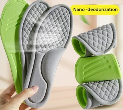 Enhance your shoe comfort with nano antibacterial sport insoles featuring memory foam, 4D massage bulges, sweat absorption, deodorant, and antibacterial properties. Suitable for men and women.