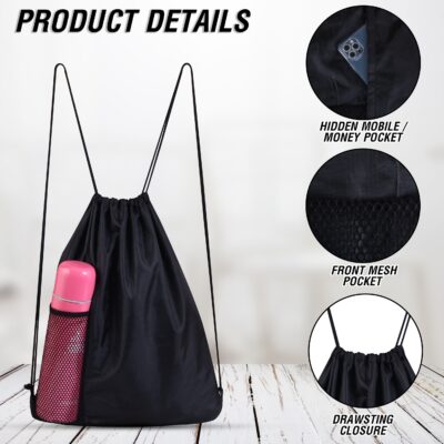Stay organized with this durable waterproof drawstring bag, featuring a spacious main compartment, outside zipper pocket, and breathable mesh pocket. Perfect for gym, school, swimming, travel, and everyday use – eco-friendly, stylish, and unisex.